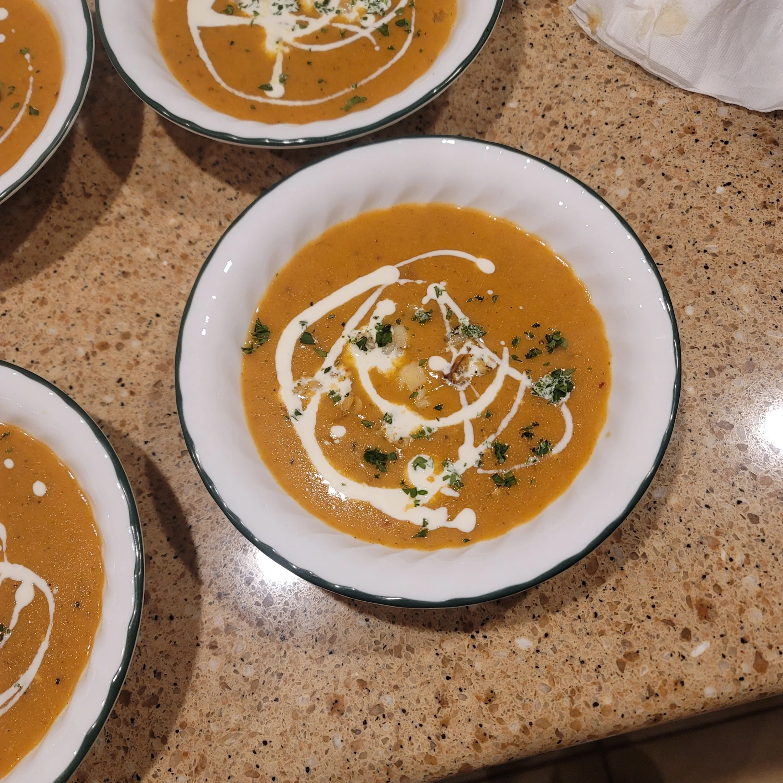 Bowl of creamy orange soup garnished with cilantro, a swirl of white cream, and a drizzle of oil.