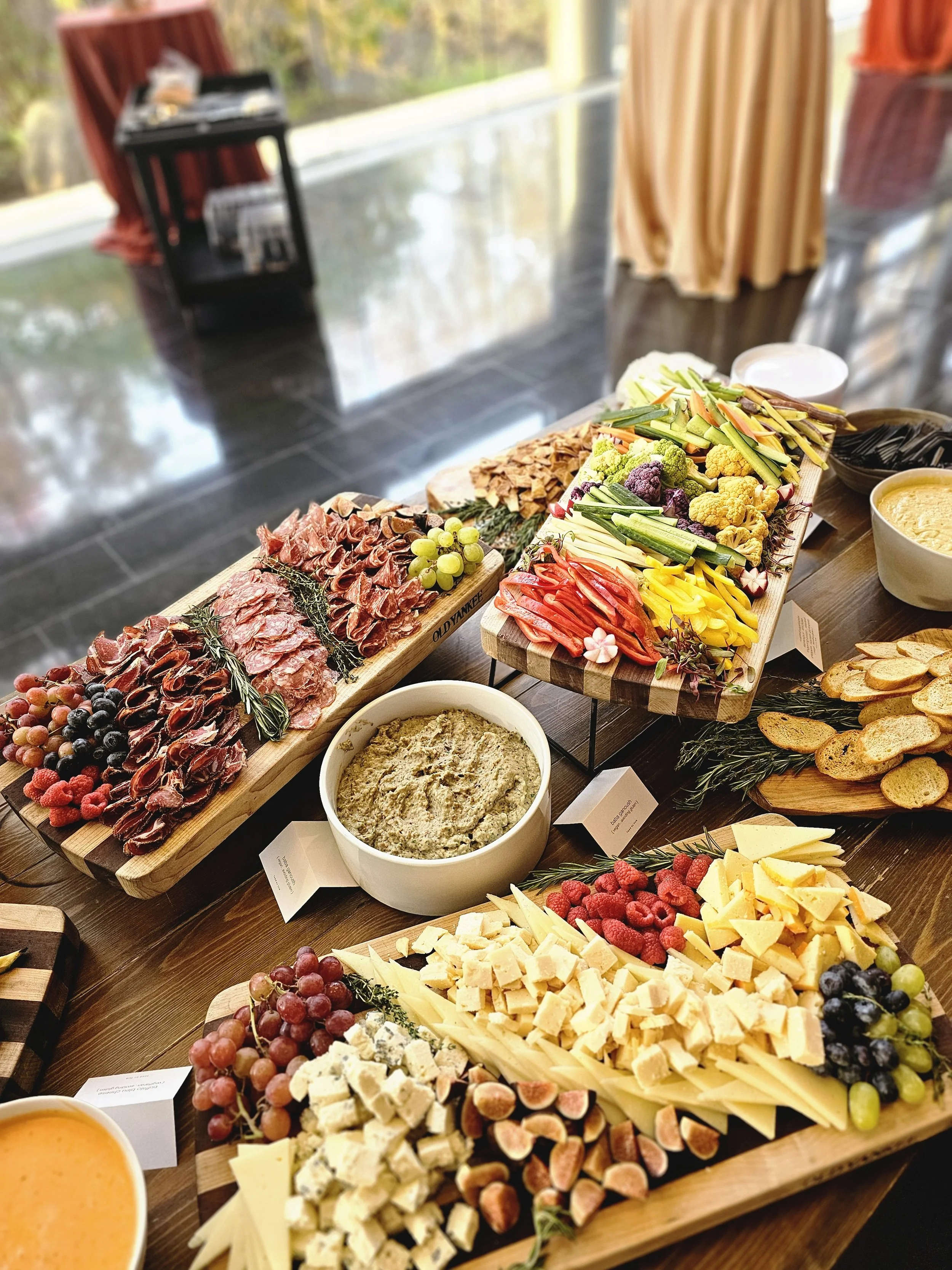 A cheese and charcuterie board with sliced meats, cheeses, grapes, berries, vegetables, and dips on a wooden table.